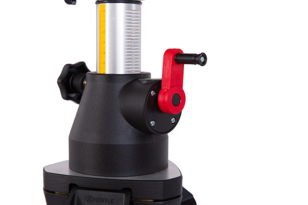 - With the gear reduction (0,7cm crank elevation / revolution) a specific height can be approached easily. Even when burdened with heavy laser devices, the 35cm crank can be moved without effort.